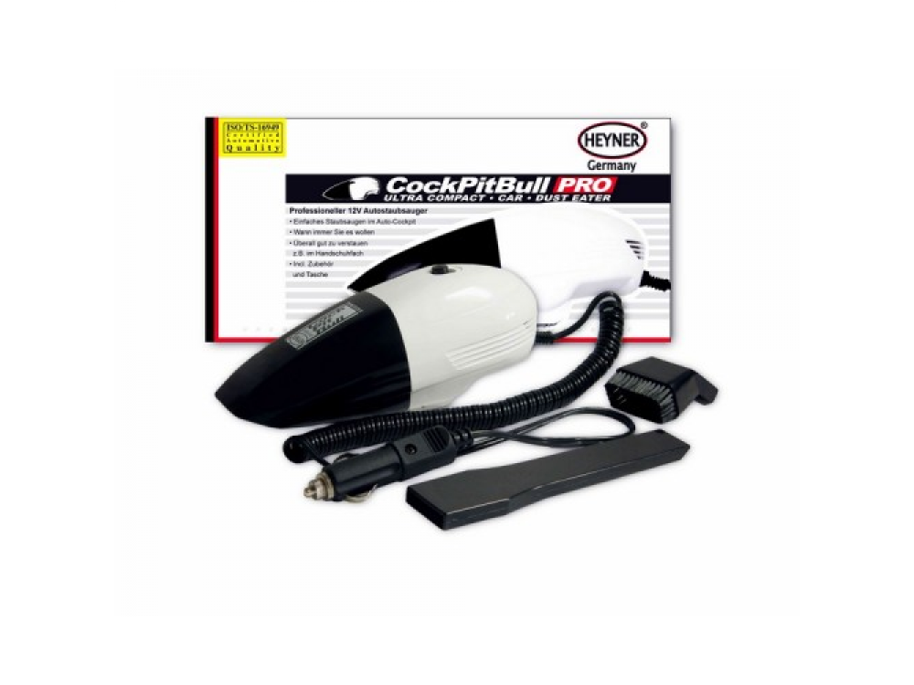 Автопылесос 12 В., 60 Вт. Сверхкомпактный CockPitBull. Спиральный самозакатывающийся шнур. Две насадки. Сумка. Длина кабеля: 150 см.