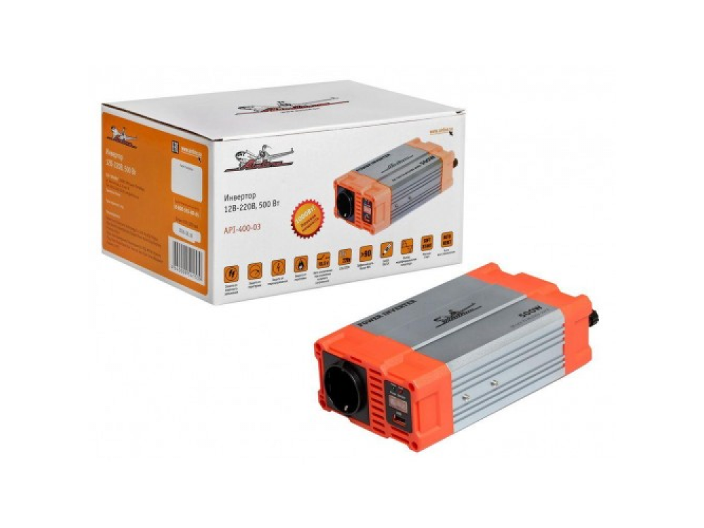 Компактный преобразователь энергии с длительной мощностью 500Вт при входном напряжении 12В является подходящим устройством для любого типа автомобиля. Мощность инвертора делает доступным одновременное подключение сразу нескольких приборов к аппарату. Эксплуатация прибора осуществляется путем подключения в гнездо прикуривателя машины.