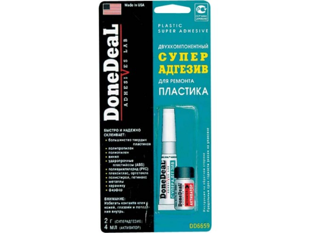 Высокотехнологичная разработка. Двухкомпонентный суперадгезив обеспечивает ремонт изделий из различных пластиков, не поддающихся склеиванию обычными клеями. Высокотехнологичная разработка. Позволяет быстро и надежно отремонтировать изделия из различных пластмасс, не поддающихся склейке обычными клеями. Характеристики: Состав - суперадгезив: цианакрилат, добавки; активатор:гептан, добавки. Цвет - прозрачный. Термоустойчивость - от -50°С до +95 °С. Прочность соединения - 204 кг/см2. Время схватывания - 30секунд. Время отвердевания - 10 минут. Время полной полимеризации - 24 часа. Область применения: Быстро и надежно склеивает: большинство твердых пластиков;полипропилен, полиэтилен;винил;ударопрочные пластмассы (ABS);поливинилхлорид (PVC);плексиглас, оргстекло;полистирол, гетинакс;металлы;керамику, фарфор.Особенности и преимущества: DD6659 обладает высокой адгезией к различным материалам;выдерживает воздействие высоких температур и большинства агрессивных жидкостей;непродолжительное время отвердевания позволяет значительно сократить и упростить технологические операции склеивания; во многих случаях прочность клеевого шва превышает прочность пластмассы.