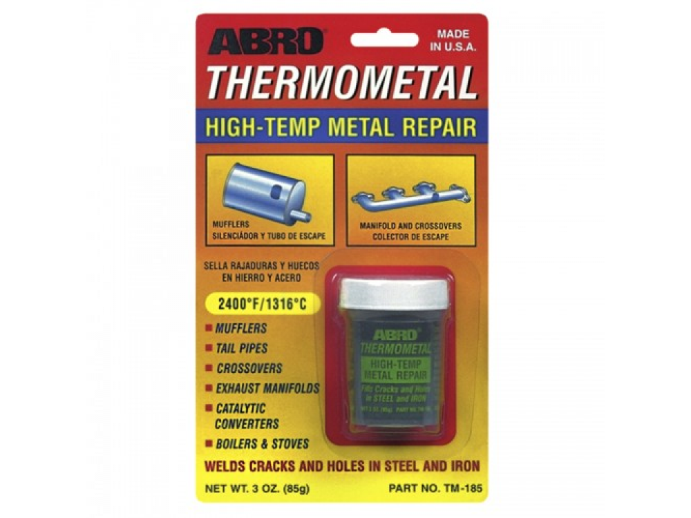 1. Полностью удалите отслаивающуюся окалину и ржавчину с помощью металлической щетки. При возможности примените пескоструй. Очистите поверхность от грязи, масла и жира. Используйте пропановый факел, если в этом есть необходимость. 2. Тщательно встряхните. Нанесите равномерным слоем. Для трещин, дырок и отверстий рекомендуется максимальная толщина слоя 6 мм. 3. Оставьте высыхать при комнатной температуре на 3–4 часа. Когда полностью затвердеет, подогрейте в течение 10–15 минут. Если образуются пузыри или вздутия, это означает, что не произошло полного затвердевания или поверхность не была чистой и сухой. Дайте металлу остыть и удалите нанесите снова. Для отверстий более 8 мм требуется металлическая армирующая сетка. Возможно, понадобится нанести два слоя термометалла. Перед тем как нанести второй слой, убедитесь, что первый слой застыл. Состав: оксид железа, дист. вода, силикат натрия, водный раствор, кремний, волластонит, черный карбон, хром, марганец, силикат натрия.